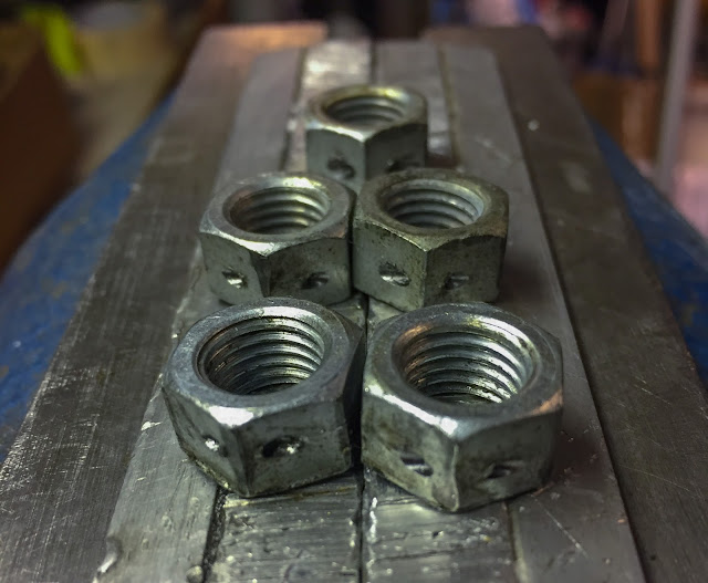 The subsequent challenge was to drill some used, however very good M10 X 1,25 engine mounting bolt nuts from a avenue H1-69 I had in inventory. the nuts used on the racer had been in as dangerous nick because the lengthy bolts. Not adequate. That is one other factor I had by no means tried earlier than. Drilling with such a small drill bit (1,5 mm) is a fragile factor. First I attempted a 2 mm one. I broke it off on the first attempt. Hmm, higher be extra mild. The laborious half right here is beginning the opening at a 90 diploma angle after which regularly, with out braking that friggin´delicate drill bit, altering the angle so it drills the opening from one flat floor to the opposite and never straight by to the threads.