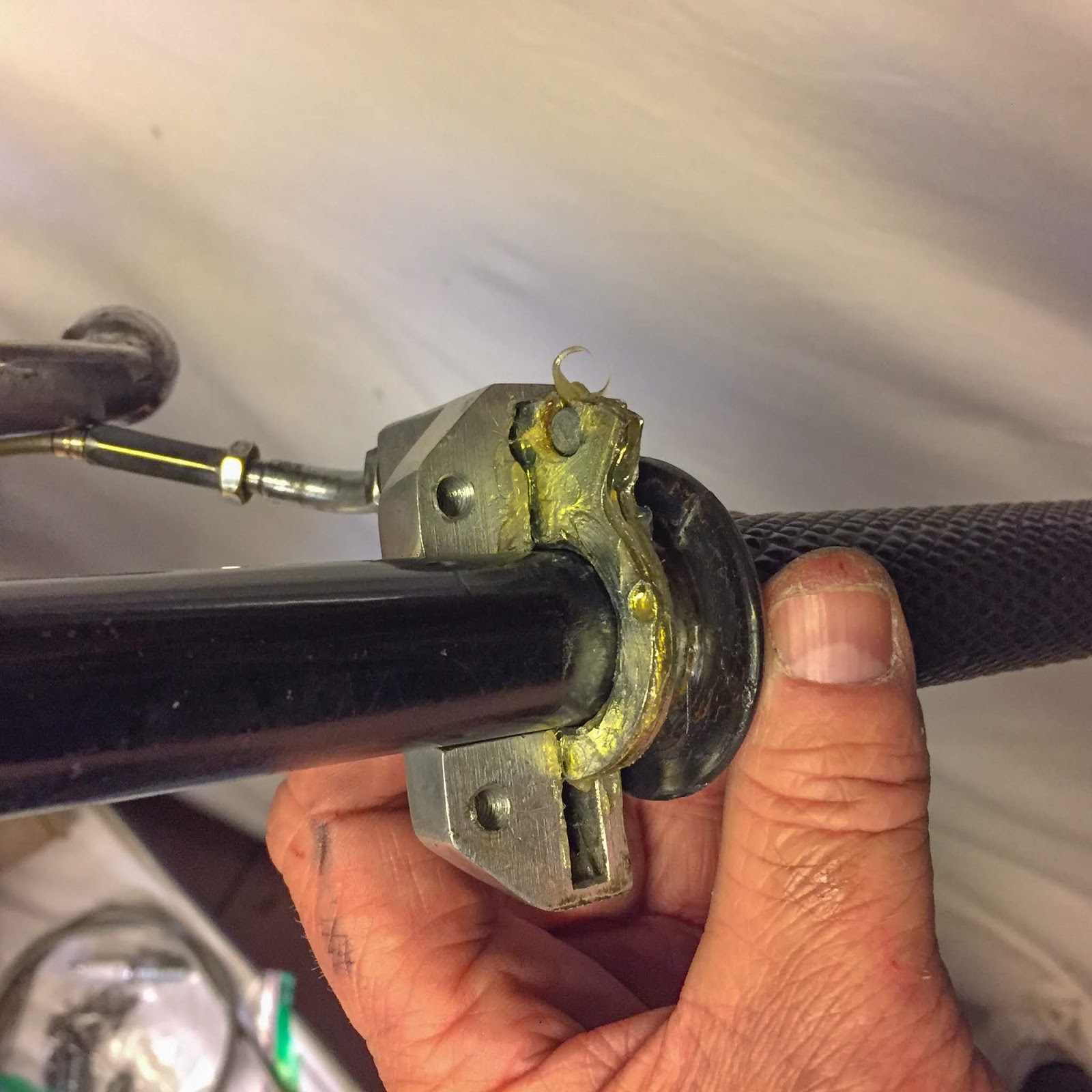 Now that the throttle cable was routed by the body and related to the throttle slides down on the carbs it was time to get the throttle grip prepared and greased.