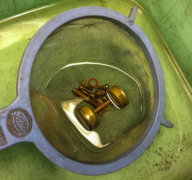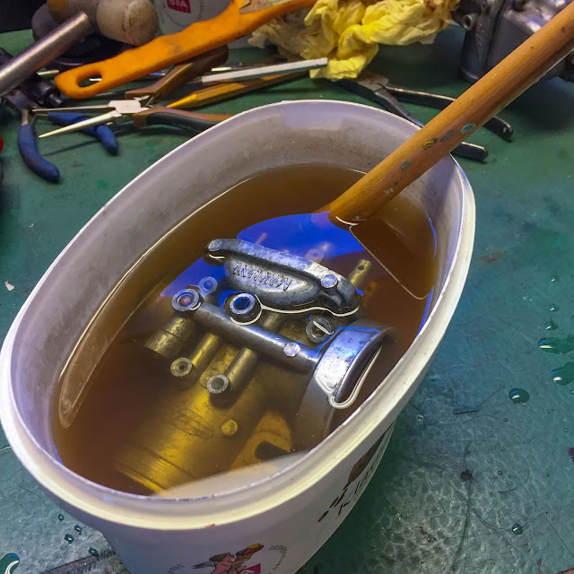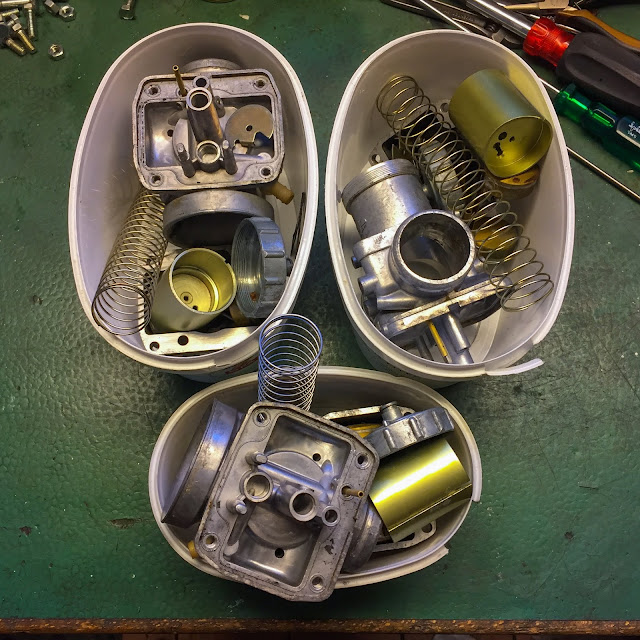 I disassembled all three of them and saved each carb in its personal plastic jar. I wished to maintain them collectively so all components belonging to a selected carburetor will get again to exactly that one. Most necessary with the throttle slides which may have developed some put on that might make them not match completely in one other carb physique. I Could be superstitious, however I choose to not take any probabilities.