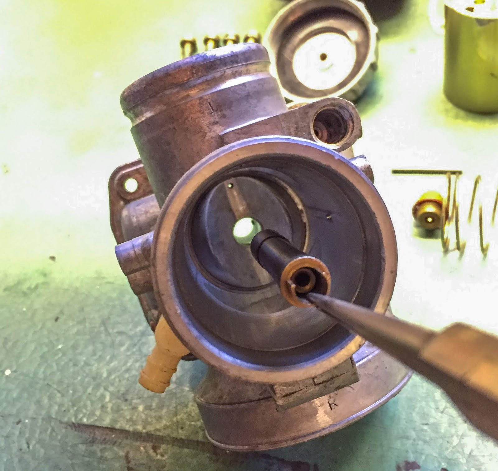 Subsequent is the needle jet, the brass tube that receives the needle from above and homes the principle jet on the backside. It’s on this half the quantity of gas getting into to the engine is decided whereas on 1/5 to 4/5 of throttle opening (approx). There´s a small slit within the jet needle that matches on to a small tab additional down within the tube. Simple does it when placing these components in place.