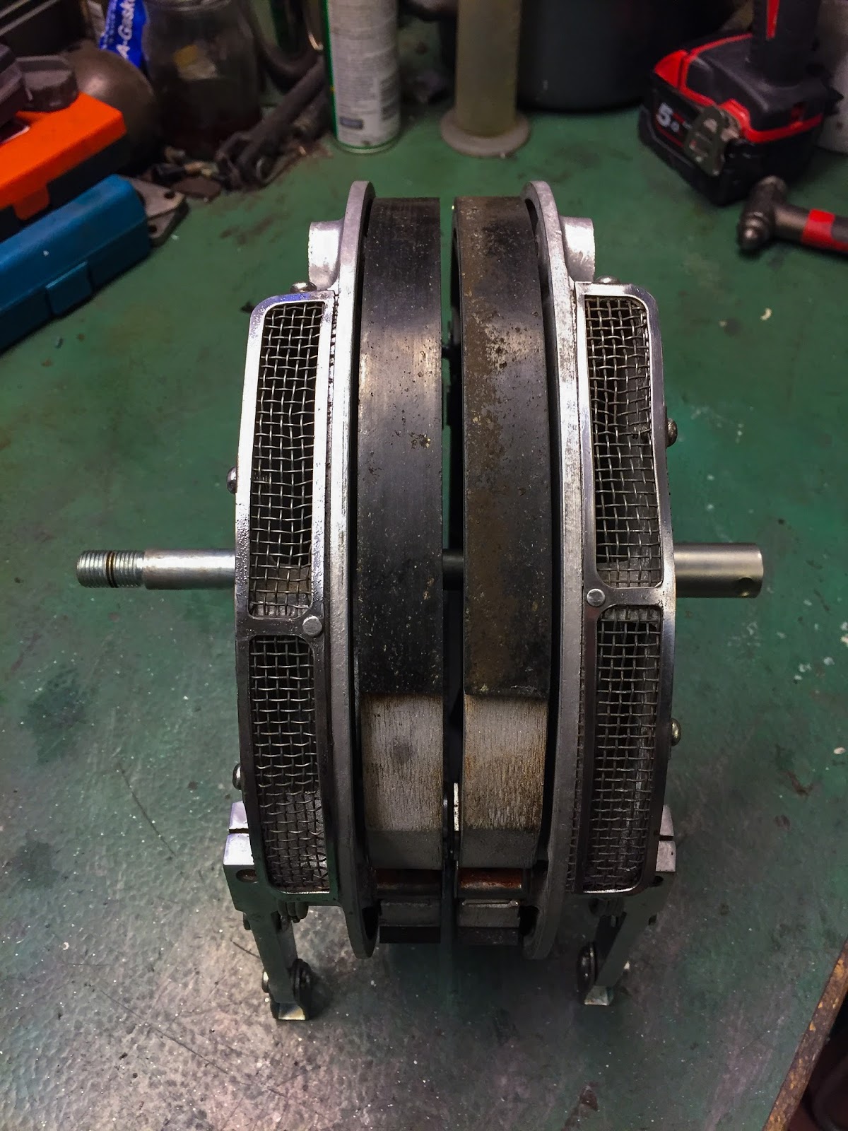 The entrance brake completed. You possibly can see the restored ventilators and likewise the surprisingly good brake sneakers. They present nearly no put on in any respect. I consider Björn acquired a few new units when he purchased the bike from Flöter. I´m fortunate, as a result of discovering these sneakers are troublesome. There´s at all times a chance to revive outdated ones and have new brake linings glued on to outdated sneakers. I´m blissful to not have