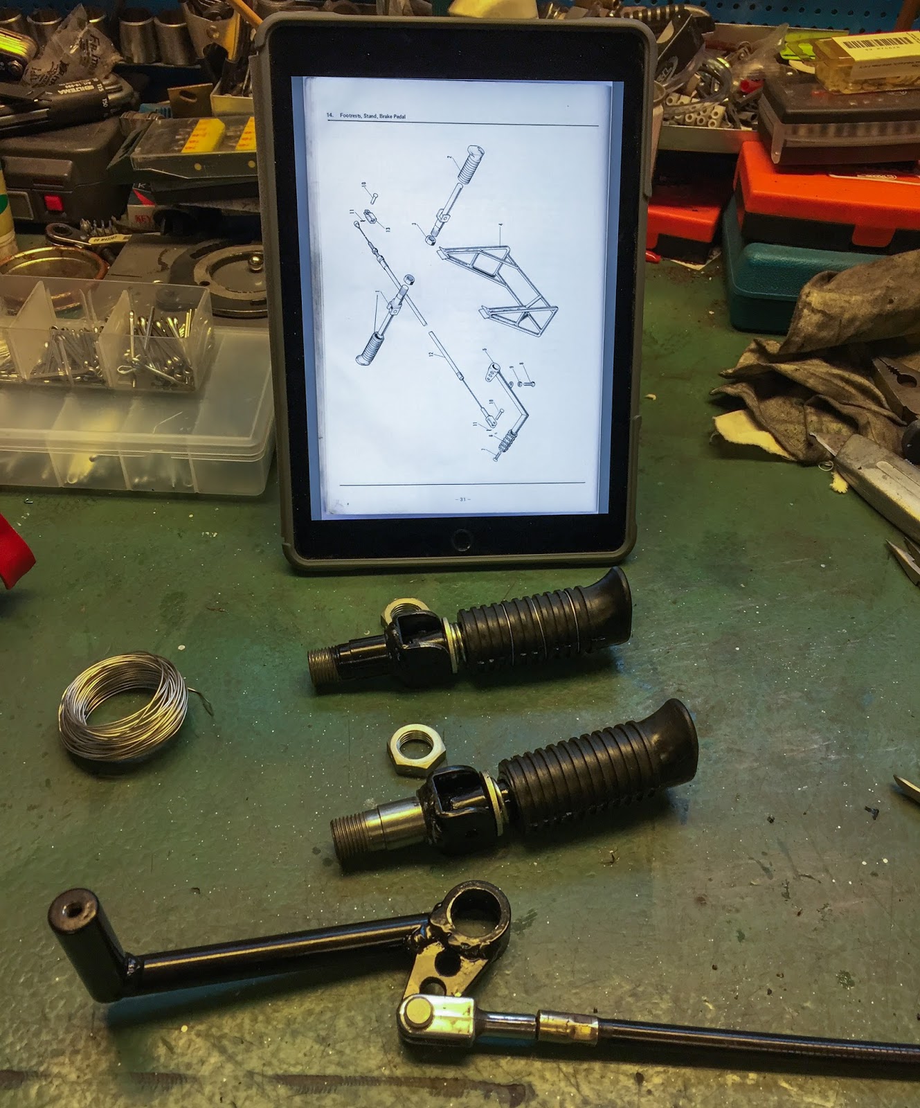 The rear brake cable and brake pedal was subsequent. It mounts to the foot peg and has to go on the body on the similar time. A bit of grinding on the peg to get the pedal on. The cable needed to be cleaned and greased. Fortunately it’s in excellent working situation with all components intact and in good nick. Having the spare components ebook helpful when assembling stuff could be very neat. I´m a contemporary man so the iPad does it!