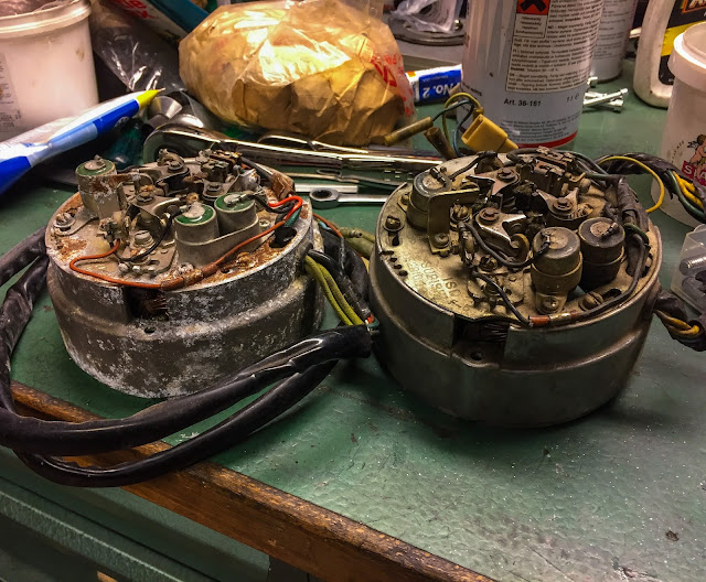 I’ve additionally began engaged on the stator and ignition on the bike. The unique yoke on the left and one from an H1B 1972 with factors ignition i Purchased on eBay on the proper. They DO look comparable! The condensers are totally different and likewise the size of the wiring. The H1B even have a bigger generator and extra windings to be able to provide electrical energy for the road tools resembling lights, horn flashers and so on. I´m going to try to rebuild as a lot as I can utilizing bits and items from the H1B to make the unique stator work pretty much as good as doable. Extra about this a part of the venture later. For now I´m glad to have a lot of the elements in my store. I´m nonetheless searching for the ignition cam 21103-004 and likewise the cam plate 21106-003. I have no idea why Kawasaki have totally different half numbers on the ignition cams right here. One motive will be they really ARE totally different in angles, length or what-not?? The timing cam plate is identical quantity, although… Fascinating!