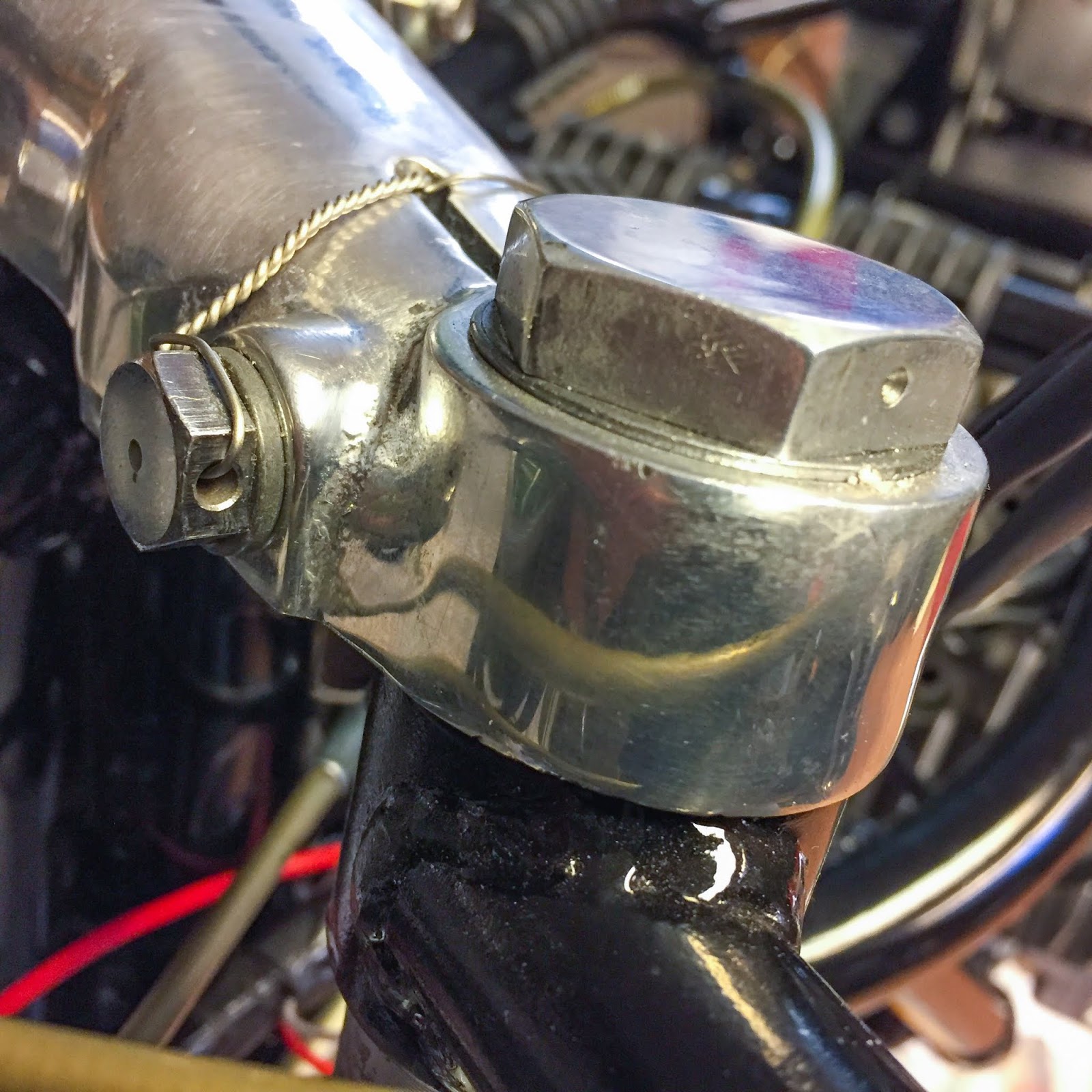 The steering head nut and screws. I´m form of happy with this one… Three fasteners with one piece of wire. Okay, I do know, it ought to have been tighter, nevertheless it´ll do for now!