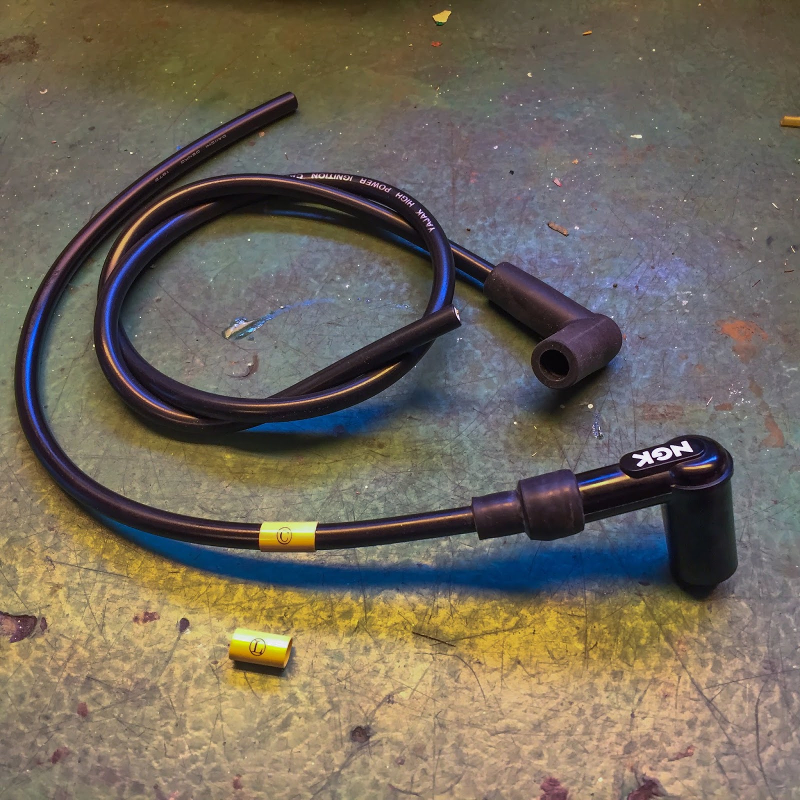 Seen right here on the precise with the “C” label ready to be connected. These NGK spark plug caps must do for now. The unique H1R (21130-015) are, after all, inconceivable to search out. I do have a plan for one thing extra inventory trying, although.